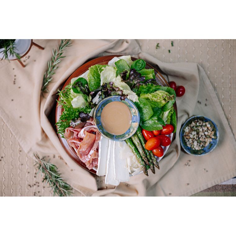 Combinação clássica do queijo brie com o presunto parma com o sabor especial dos aspargos e o agridoce das castanhas caramelizadas.