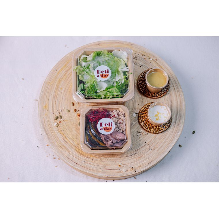 Mix de folhas, rosbife caseiro, arroz 7 grãos, beterraba, croutons de pão sírio, abóbora assada, pasta de ricota com limão siciliano. Molho mostarda e mel.