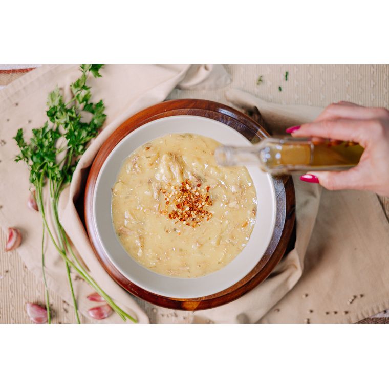 Mandioquinha, costela bovina desfiada, alho, cebola e azeite de oliva.